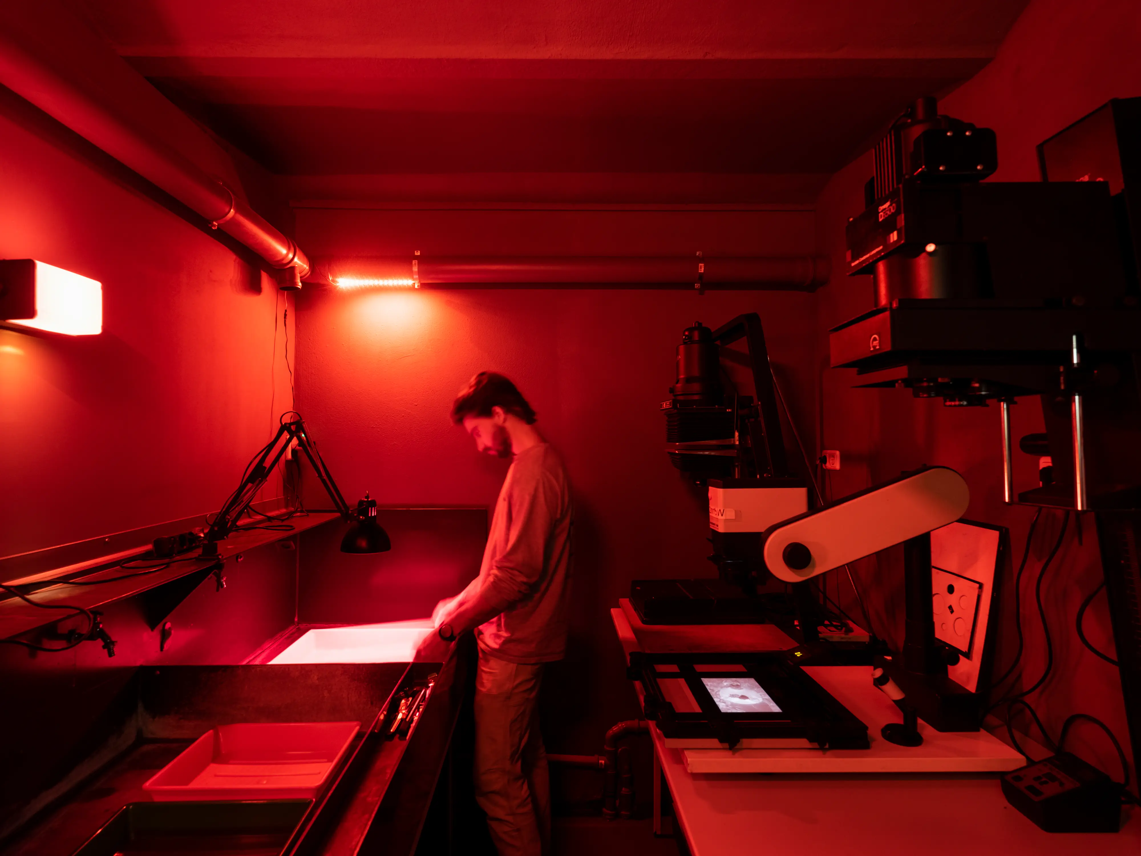 The Ostkreuzschule has a digital workshop with scanners, printers and computer workstations equipped with the latest photo and design software. We also have an analogue black and white and color laboratory, a photo studio with its own photo equipment lending service and an extensive photo book library. The workshops and laboratories at the Ostkreuzschule are mainly used by students on the photography program, however can also be used by students of the photography master class, depending on availability and a corresponding introductory appointment for a fee.